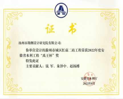 在經(jīng)過申報單位申報、主管部門審查推薦的基礎(chǔ)上,經(jīng)資格初審、專家組現(xiàn)場復(fù)查、評審委員會評審、廳網(wǎng)站公示、主管部門批準(zhǔn)等評選程序后,我公司設(shè)計的“滁州市城區(qū)紅廟一站工程”“滁州市城區(qū)紅廟二站工程”2個項目喜獲“禹王杯”獎項。